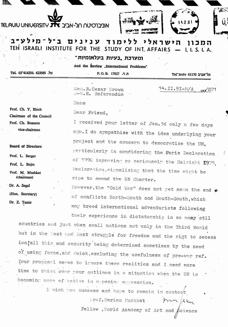 1991 Wrote: Prof. Marian Mushkat, Fellow, World Academy of Art and